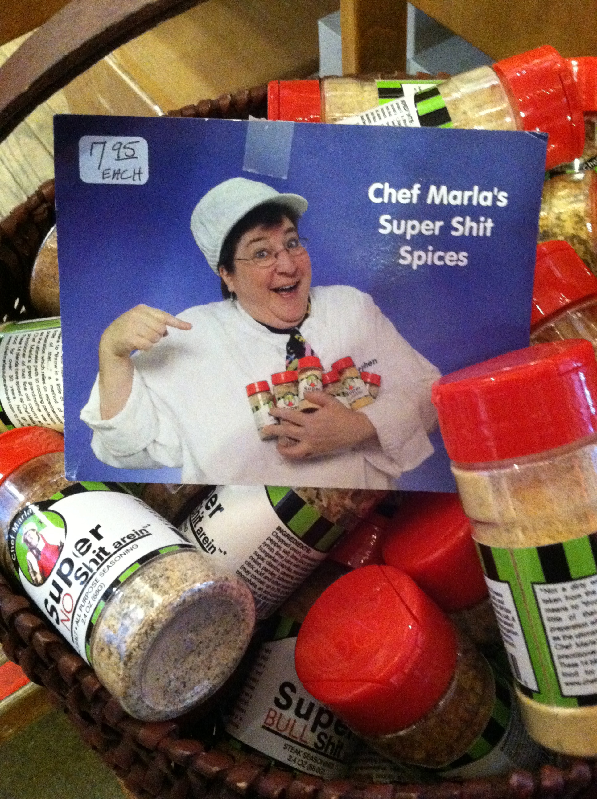 If you want to spice things up, head over to one of the many kitchen stores and pick up some of Chef Marla’s Yiddish “Shit-arein” spices, which translated means, “to throw a little of this and a little of that.” They come in Dipshit, Horseshit, Shootin the Shit, Chicken Shit and Super Shit.
