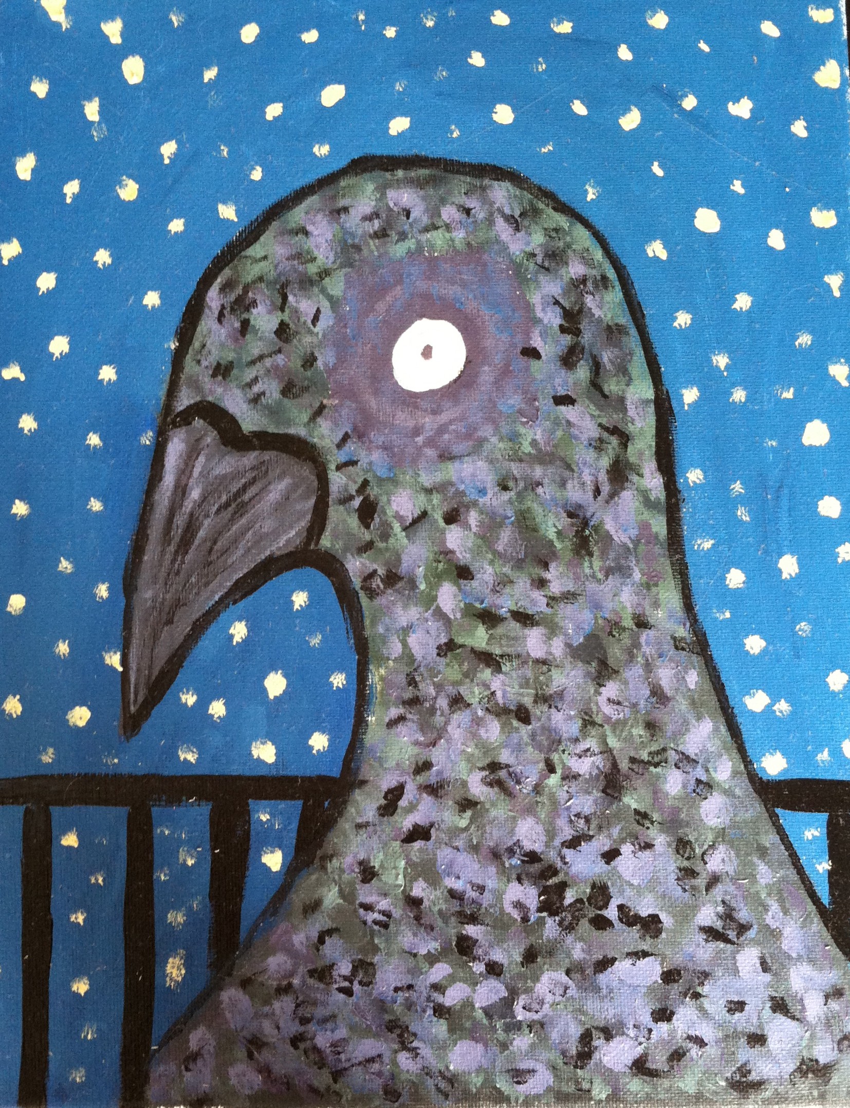 “My pigeon nostalgia took on many whimsical and disturbing forms. I began painting pigeons and writing pigeon poetry. It was what I like to call my “Pigeon Renaissance.” This was a time of great creative flourishing where I painted pigeon masterpieces such as “Pigeon by Day” and “Starry Night Pigeon.” The pigeons were all-consuming. I’d try to draw